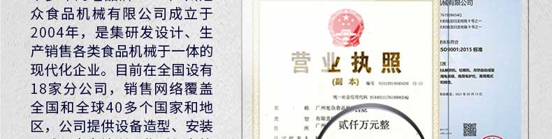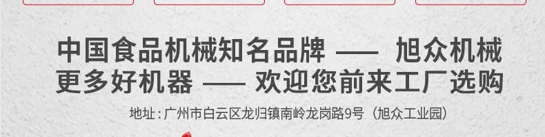 廣州旭眾食品機械有限公司是一家集科研開發(fā),生產(chǎn)設計,營銷服務為一體的現(xiàn)代化生產(chǎn)企業(yè)?,F(xiàn)代化生產(chǎn)車間,精湛制造技術(shù),所產(chǎn)機械歷經(jīng)市場重重考驗,不斷贏得海內(nèi)外客戶的贊譽。