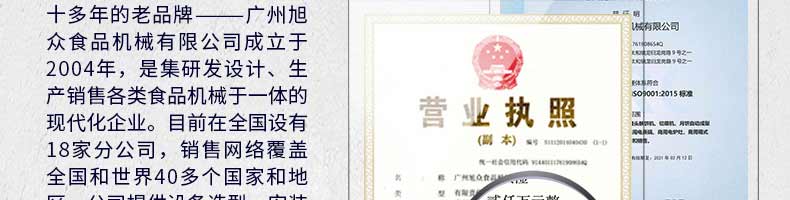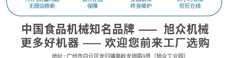 廣州旭眾食品機械有限公司是一家集科研開發(fā),生產(chǎn)設計,營銷服務為一體的現(xiàn)代化生產(chǎn)企業(yè)?,F(xiàn)代化生產(chǎn)車間,精湛制造技術,所產(chǎn)機械歷經(jīng)市場重重考驗,不斷贏得海內(nèi)外客戶的贊譽。