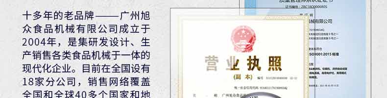 廣州旭眾食品機(jī)械有限公司是一家集科研開發(fā),生產(chǎn)設(shè)計(jì),營(yíng)銷服務(wù)為一體的現(xiàn)代化生產(chǎn)企業(yè)?,F(xiàn)代化生產(chǎn)車間,精湛制造技術(shù),所產(chǎn)機(jī)械歷經(jīng)市場(chǎng)重重考驗(yàn),不斷贏得海內(nèi)外客戶的贊譽(yù)。