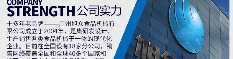 廣州旭眾食品機械有限公司是一家集科研開發(fā),生產設計,營銷服務為一體的現(xiàn)代化生產企業(yè)?,F(xiàn)代化生產車間,精湛制造技術,所產機械歷經市場重重考驗,不斷贏得海內外客戶的贊譽。
