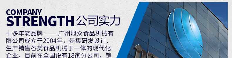 廣州旭眾食品機(jī)械有限公司是一家集科研開(kāi)發(fā),生產(chǎn)設(shè)計(jì),營(yíng)銷服務(wù)為一體的現(xiàn)代化生產(chǎn)企業(yè)。現(xiàn)代化生產(chǎn)車間,精湛制造技術(shù),所產(chǎn)機(jī)械歷經(jīng)市場(chǎng)重重考驗(yàn),不斷贏得海內(nèi)外客戶的贊譽(yù)。