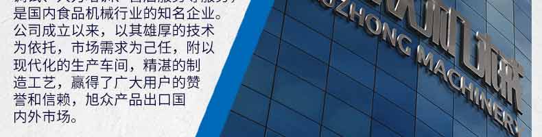 廣州旭眾食品機(jī)械有限公司是一家集科研開發(fā),生產(chǎn)設(shè)計,營銷服務(wù)為一體的現(xiàn)代化生產(chǎn)企業(yè)?,F(xiàn)代化生產(chǎn)車間,精湛制造技術(shù),所產(chǎn)機(jī)械歷經(jīng)市場重重考驗,不斷贏得海內(nèi)外客戶的贊譽(yù)。