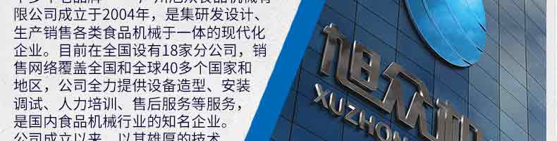 廣州旭眾食品機械有限公司是一家集科研開發(fā),生產(chǎn)設計,營銷服務為一體的現(xiàn)代化生產(chǎn)企業(yè)?,F(xiàn)代化生產(chǎn)車間,精湛制造技術,所產(chǎn)機械歷經(jīng)市場重重考驗,不斷贏得海內(nèi)外客戶的贊譽。